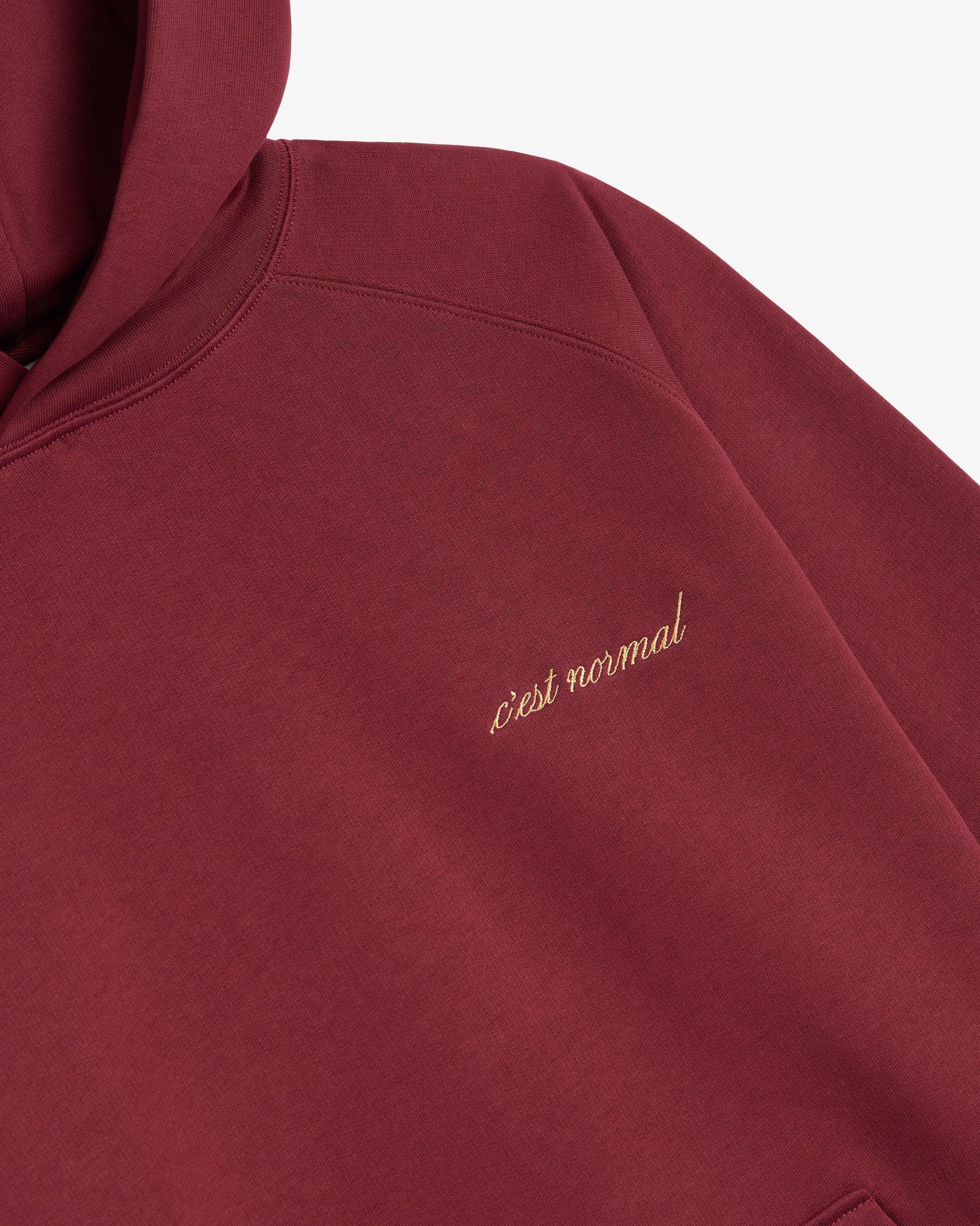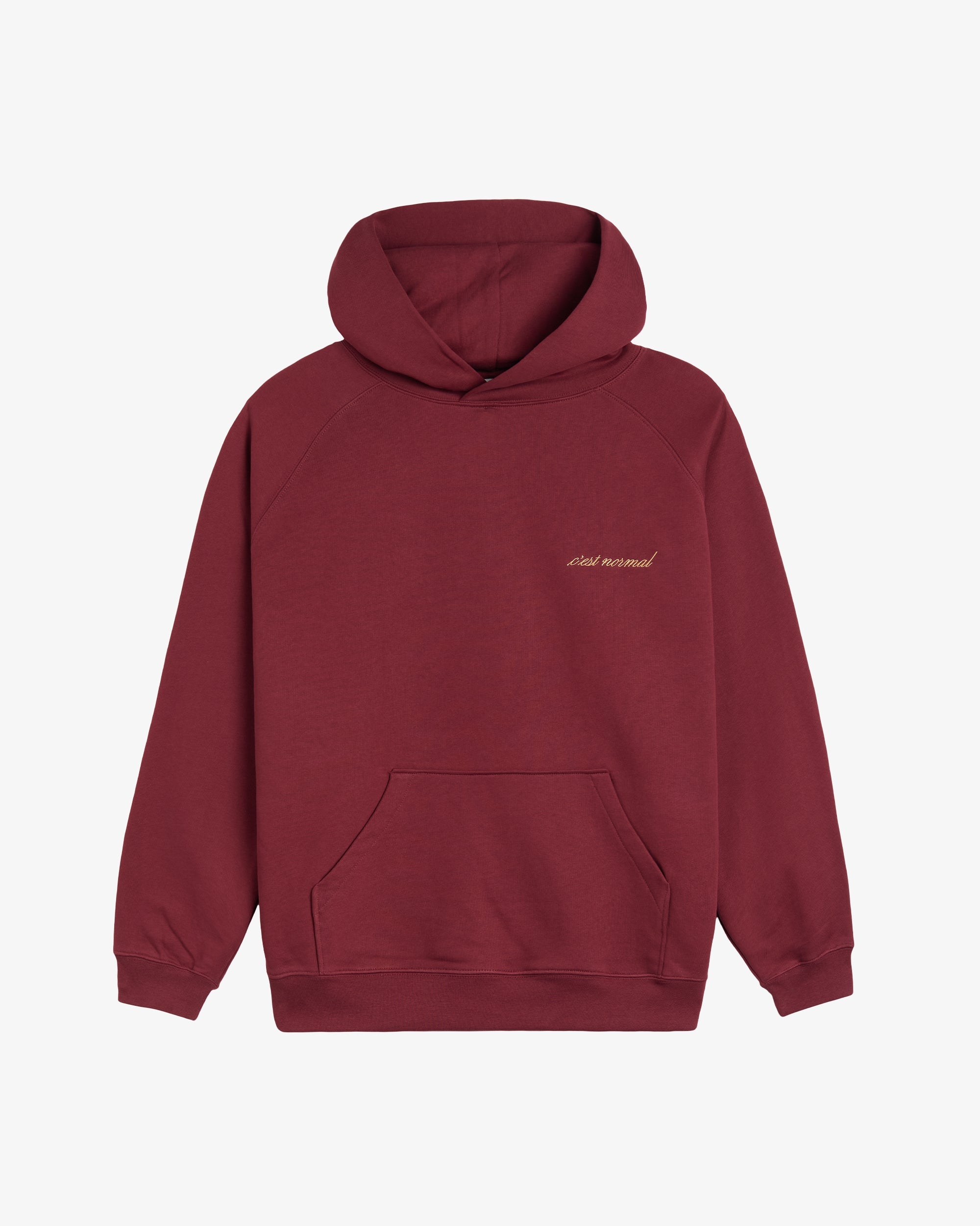 The fit is the same as our oversized French Riviera Hoodie that so many of you loved. It's roomy but refined, with raglan sleeves, a crossover hood (no drawstring), and our low key cursive logo embroidered on the chest.