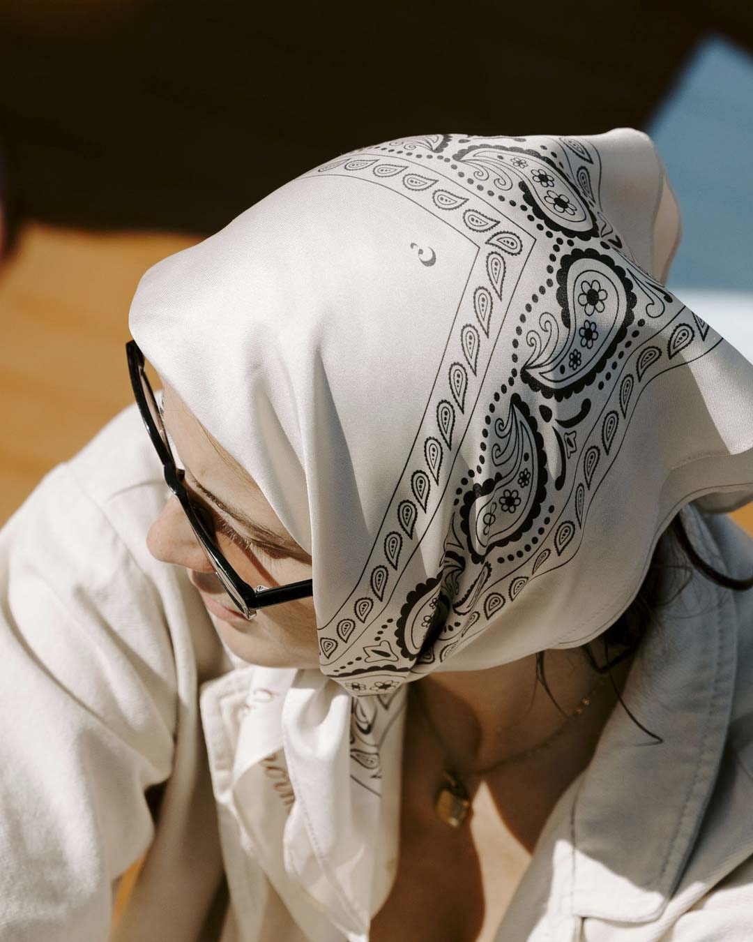 STYLING TIPS: Benni wears this scarf, most like a tie, rolled diagonally and tied with a low knot in front. The ladies are wearing it as a neck or headscarf or rolled up as a headband.